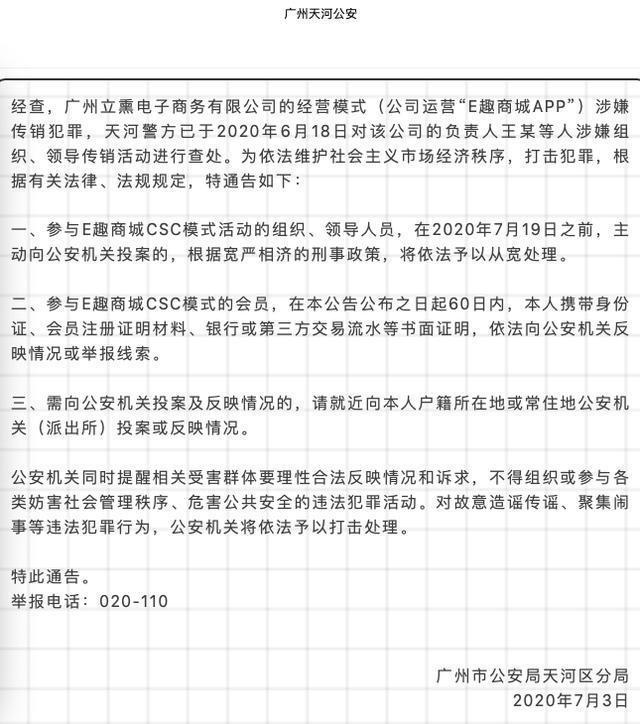 二、参与E趣商城CSC模式的会员,在本公告公布之日起60日内,本人携带身份证、会员注册证明材料、银行或第三方交易流水等书面证明,依法向公安机关反映情况或举报线索。