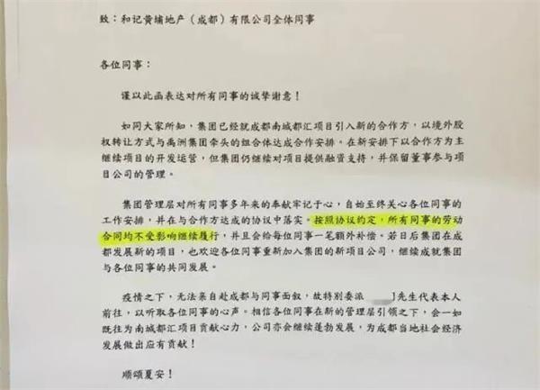 长实集团很快发出了一封致和记成都公司全体员工的告别信,在信中,其表示已与禹洲集团、瑞卓置业就员工的工作安排达成协议,按照约定,所有员工的劳动合同不受影响继续履行。也就是说,原和记成都公司员工的劳务关系将平移至到新公司。