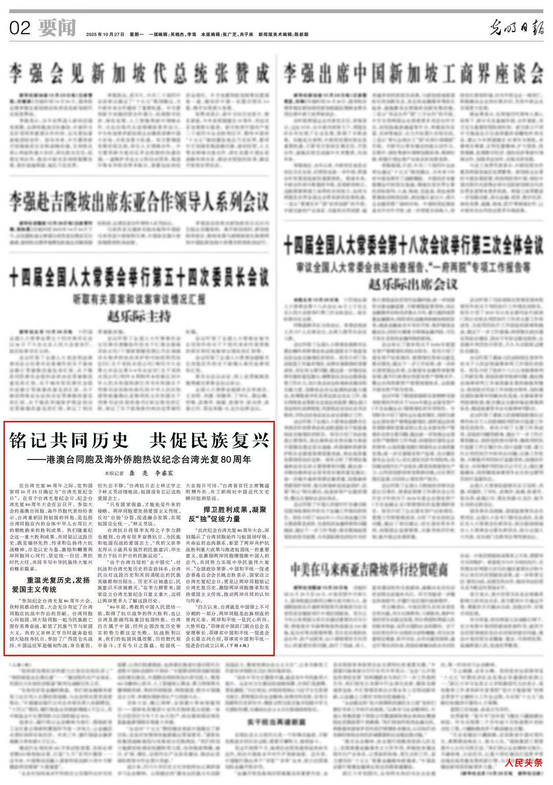此篇《光明日报》专题报道的推出,不仅是对台湾光复80年的回望,更展现了中央党报对港澳台及海外华文媒体的高度关注与深情寄望。作为海内外重要华文媒体,共工新闻社长期关注海峡两岸关系与海外侨界动态,积极推动文化交流与历史传承工作,为构建两岸命运共同体、讲好中国故事贡献力量。(廖红麟)
