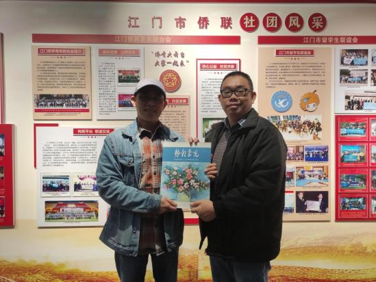 陈保平教授(左)向江门市侨媒中心赠书